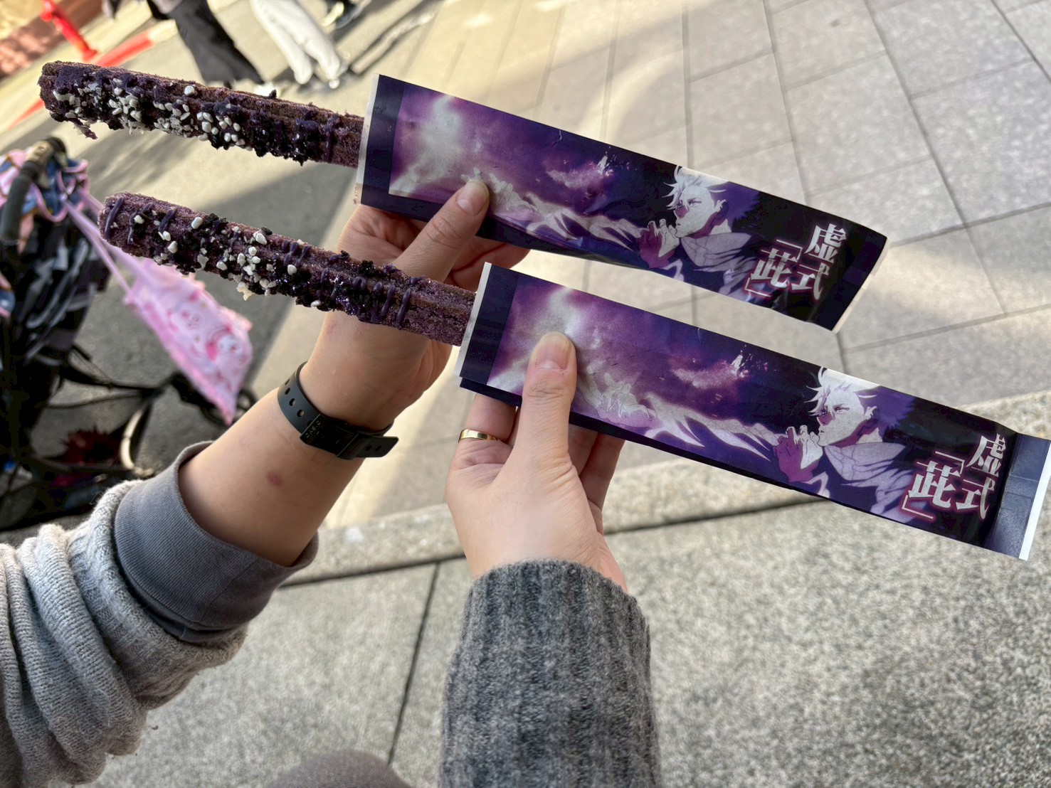 最強の呪術師:五条悟の術式「虚式 茈」をイメージした紫色のチュリトス(ミックスベリー味)と虎杖の「黒閃」を表現した黒いピザブレッド(旨辛ガーリック)が販売されています。