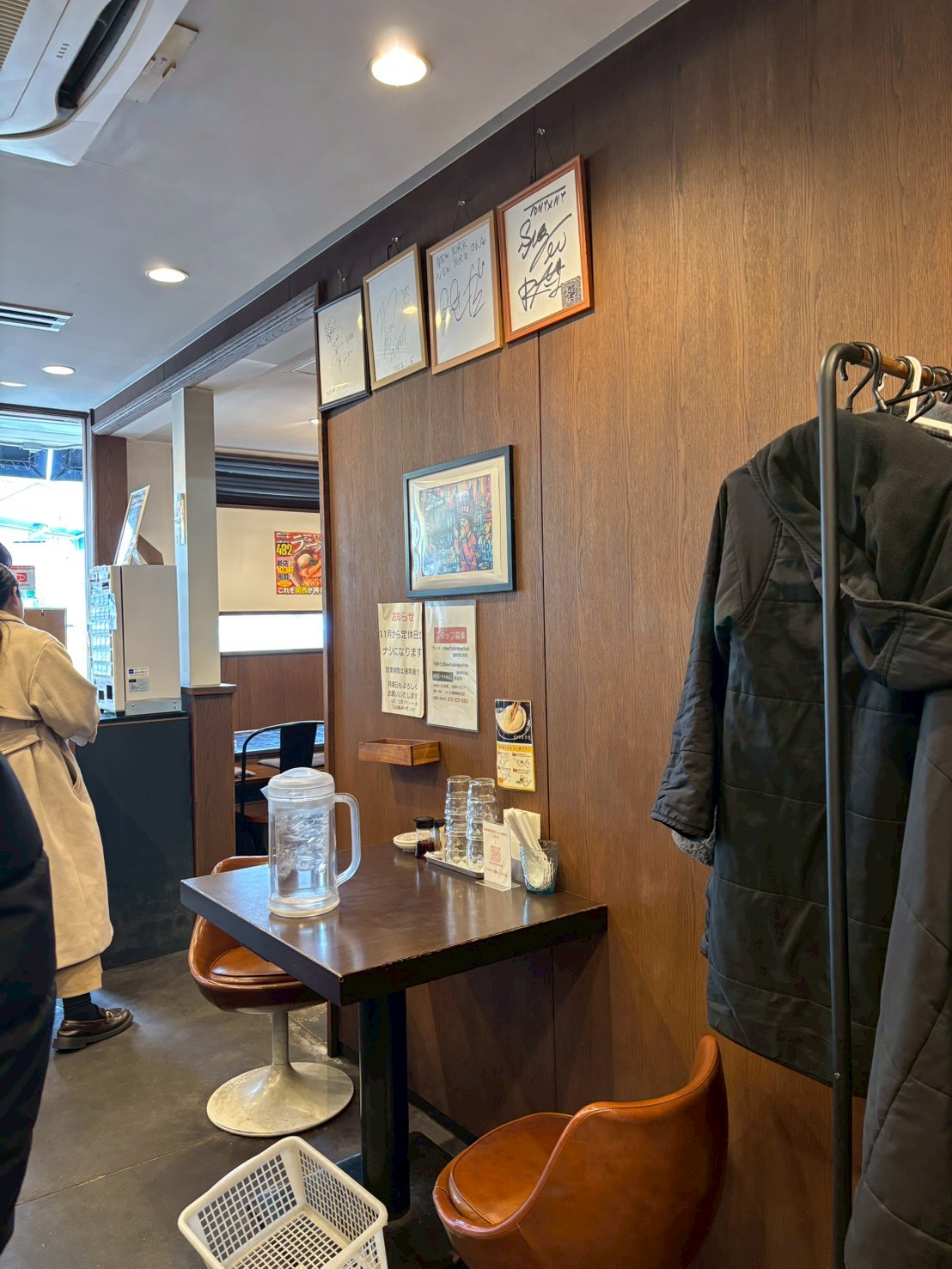 カウンター席後ろには、ハンガーラックや洗面台があり、足元には荷物を入れるカゴもあります。