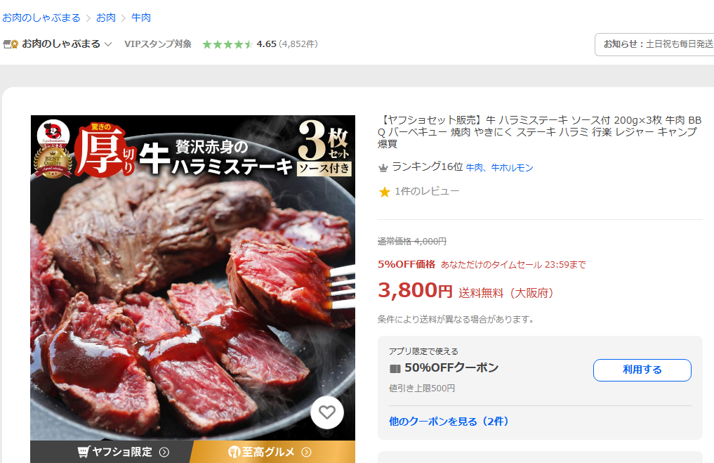 今回私が購入した【牛ハラミステーキ ソース付 200g×3枚】(4000円)は、ヤフショ限定の至高グルメです。