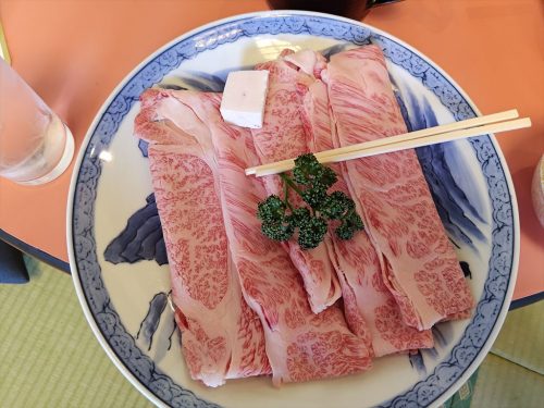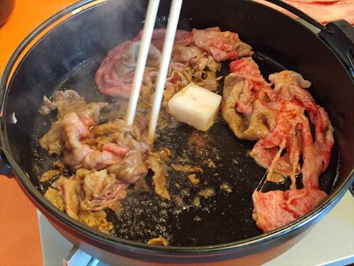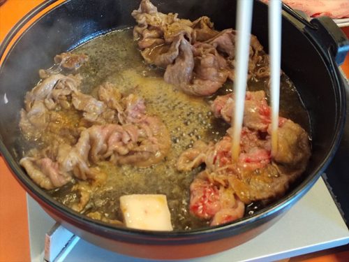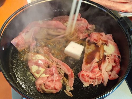 希少部位を使ったすき焼きです。この部位の肉はサーロインの横にあり、もっとも厚み