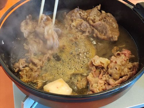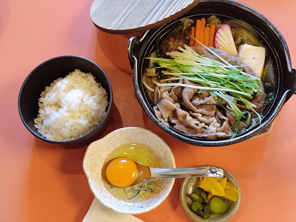 牛鍋です。すき焼きと同様、卵を付けていただきます。