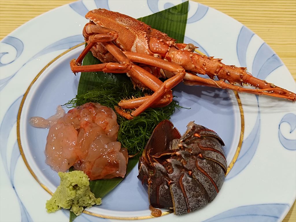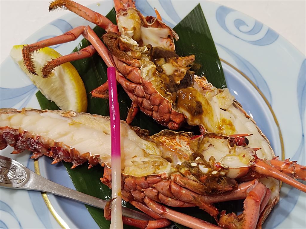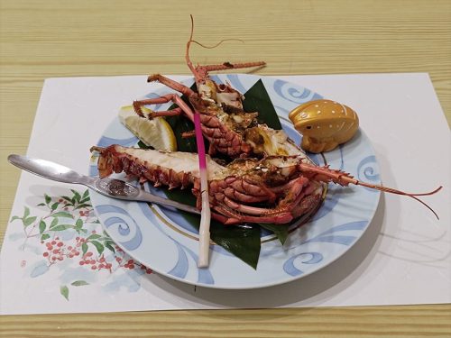 伊勢海老中片身が2つありますが、これは刺身と塩焼きの2パターンをいただく