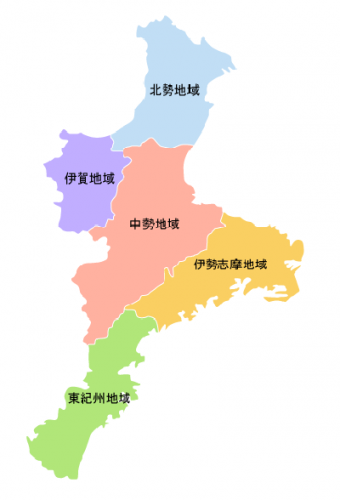 現在の三重県を5つに区分すると「北勢」「伊賀」「中勢」「南勢(伊勢志摩)」