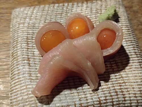 見た目が愛らしいお造りで6つの内半分(3つ)は卵黄の醤油漬けを巻いて