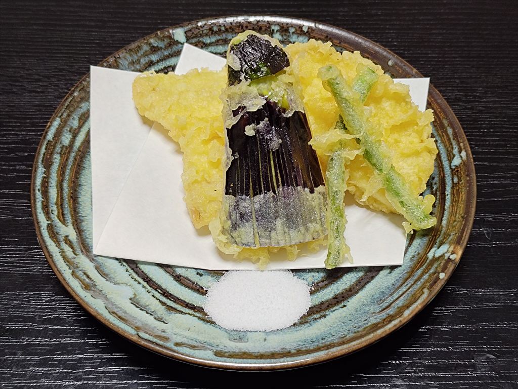 揚物に向いている食材です。適量を塩につけていただきます。食材を自前で