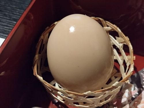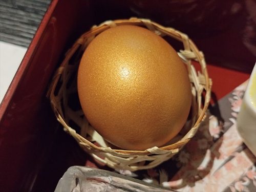 金の卵は殻付きのまま燻製したものに殻を金箔で色付けしています。