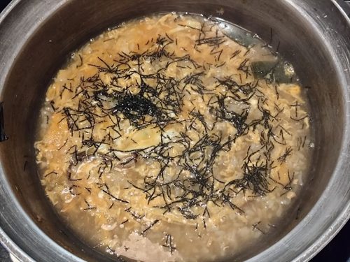 次は雑炊となるため、ここで残っていた豆腐やワカメをお皿に入れて