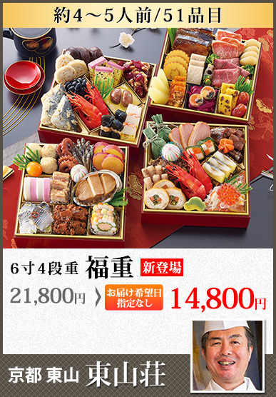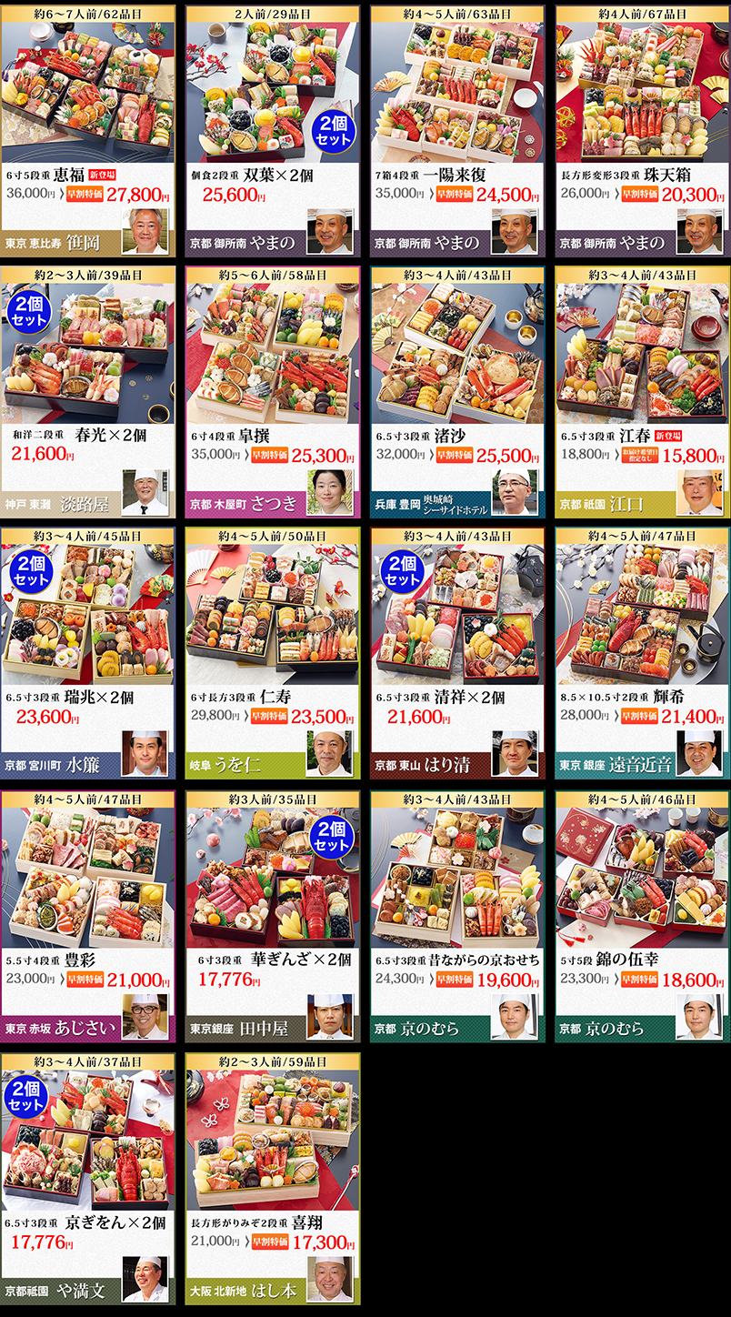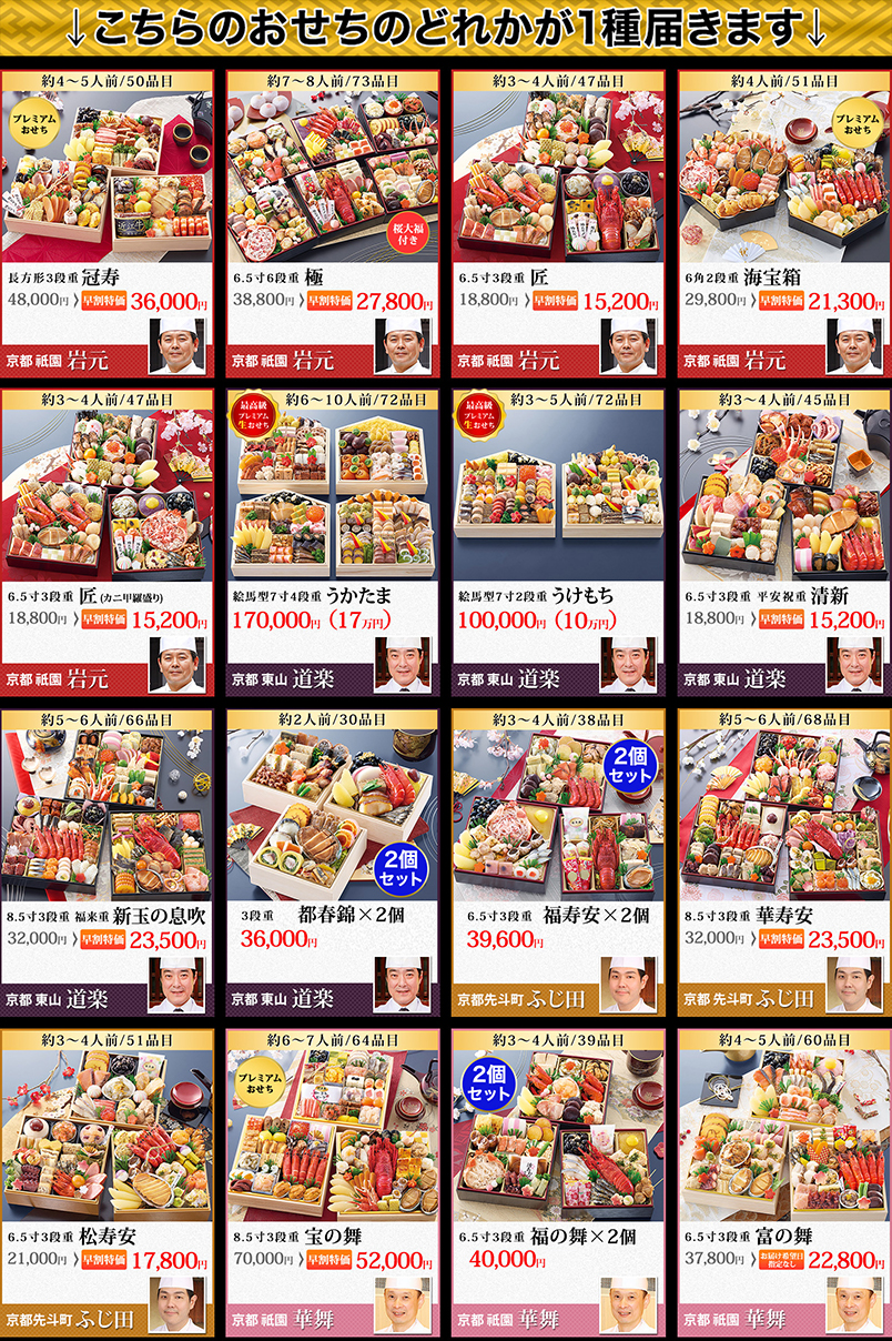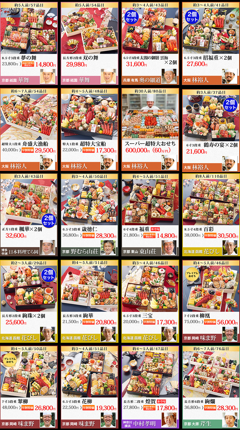 おせち福袋の価格に2,000円ほどプラスすることで、大人数向けのおせちをお手頃な価格でゲットすることできます。できるだけ大ボリュームのおせちが欲しいという方には下記2つのおせちが超おすすめです!