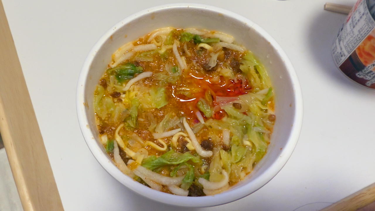 辛みそきんは、辛味油を入れると一気に赤みを帯び、食欲をそそる香りが立ち込めます。辛さは「旨みが感じられるギリギリの辛さ」という開発者のこだわり通り、しっかり辛いけれど、決して食べられないほどではない、絶妙なバランスです。特に、食べ進めていくと予想以上に辛さを感じ、汗をかくレベルでした。具材のキャベツの甘みが、辛さをただの刺激で終わらせずに、深い旨味に変えているのが分かります。