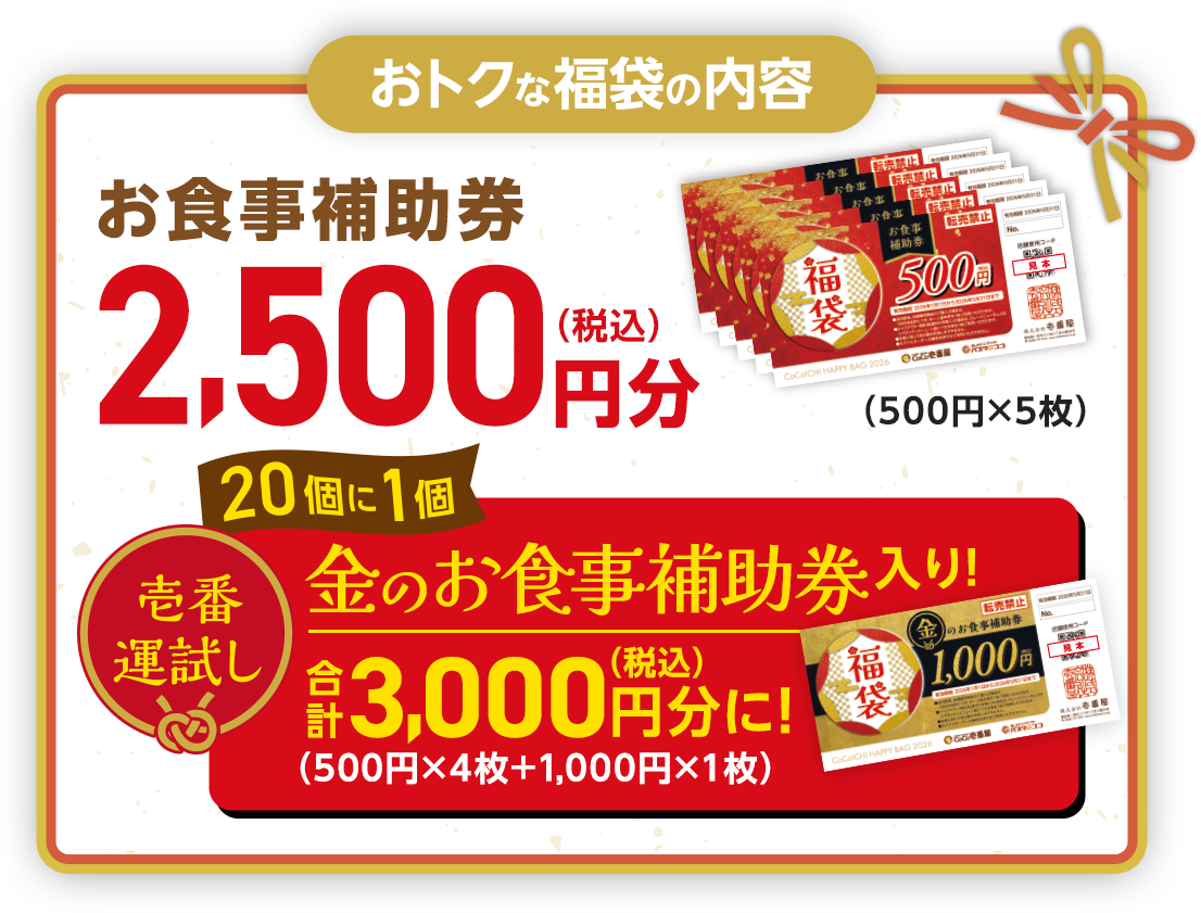 通常は500円券が5枚ですが、ラッキーな袋には「1,000円券」が1枚紛れ込んでいて、合計3,000円分になります。当たれば福袋代より500円も多く金券が貰えるなんて、太っ腹すぎませんか?