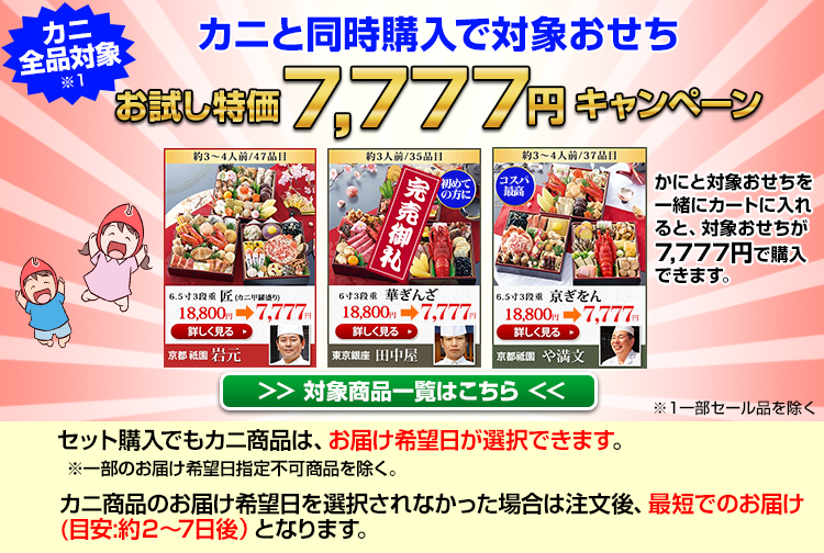 それではまず、カニとの合わせ買いで「18,800円→7,777円」になる驚きの対象おせちをご紹介します。