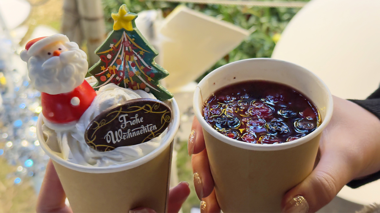 冷えた体を温めてくれるのが、スパイスとフルーツの香りが豊かな「グリューワイン(ホットワイン)」です。お酒が飲めない方やお子様には、濃厚な「ホットチョコレート」や「ホットココア」が大人気。マシュマロがトッピングされた映えメニューもありました!