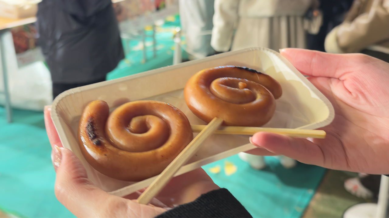 会場に入ると、香ばしいソーセージの香りが漂ってきます。定番の「ぐるぐるソーセージ」や、スパイスの効いた「カリーヴルスト」はビールとの相性が抜群。寒い屋外で食べる熱々のビーフシチューや、チーズたっぷりのポテト料理も人気でした。