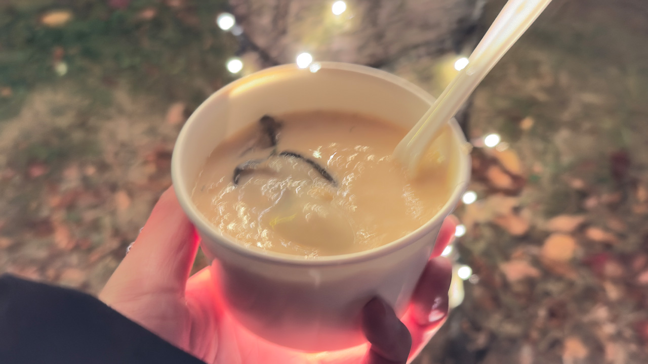 そしてコチラが牡蠣のクラムチャウダー。なんとなく黒っぽく浮いているのが牡蠣です。牡蠣は二個しか入っていませんが、味自体はめちゃくちゃ濃厚でかなり美味しかったです。ただ、値段が少しお高めだったのは少しネックかなとは思います。