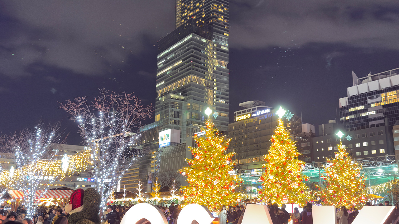 芝生広場に設置された巨大なクリスマスツリーと、ドイツ風のヒュッテの温かい光、そして背後にそびえ立つハルカスの近代的な光が融合して、とても都会的かつ幻想的な雰囲気でした。どこを切り取っても絵になるので、写真を撮っている人がたくさんいましたよ。