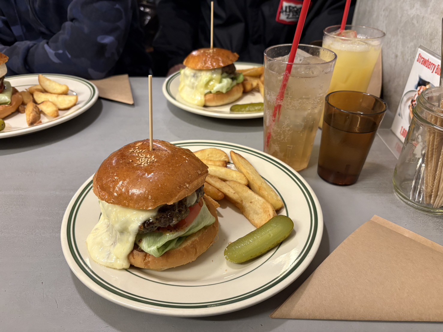 アメリカンサイズのハンバーガーにポテトとピクルス付きの満足感のあるセットとなっています。