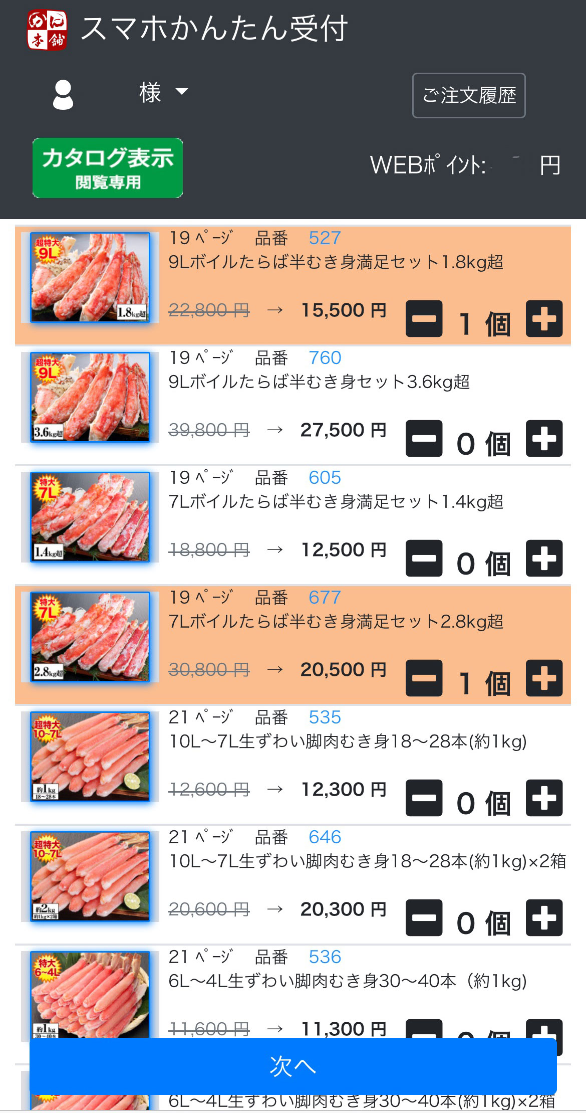 プラスマーク、マイナスマークで数量の調整し、青色の「次へ」をタップ。