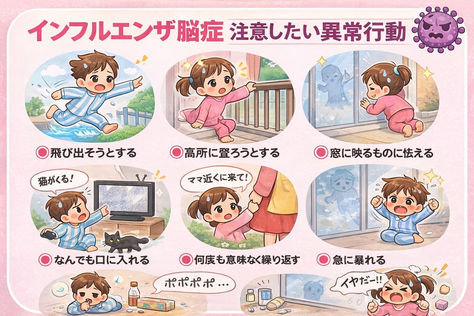インフルエンザでは、まれに異常行動がみられることがあります。