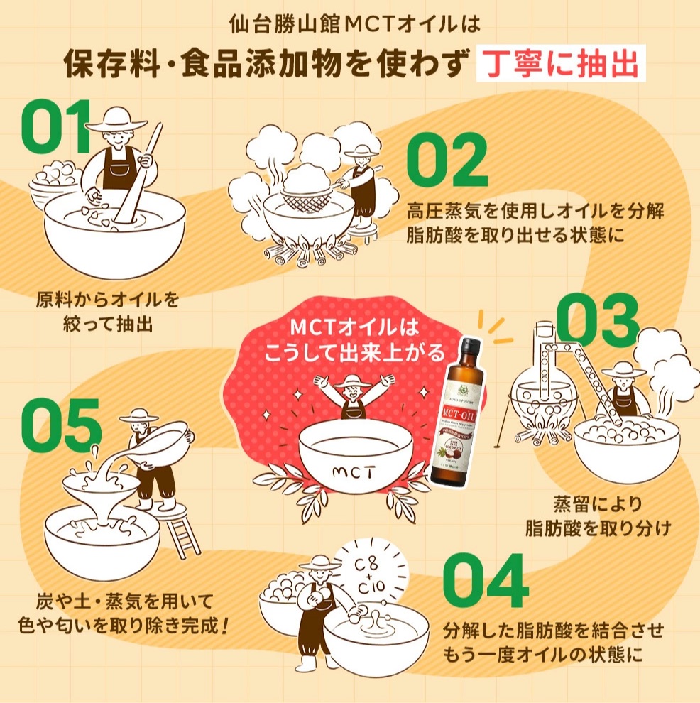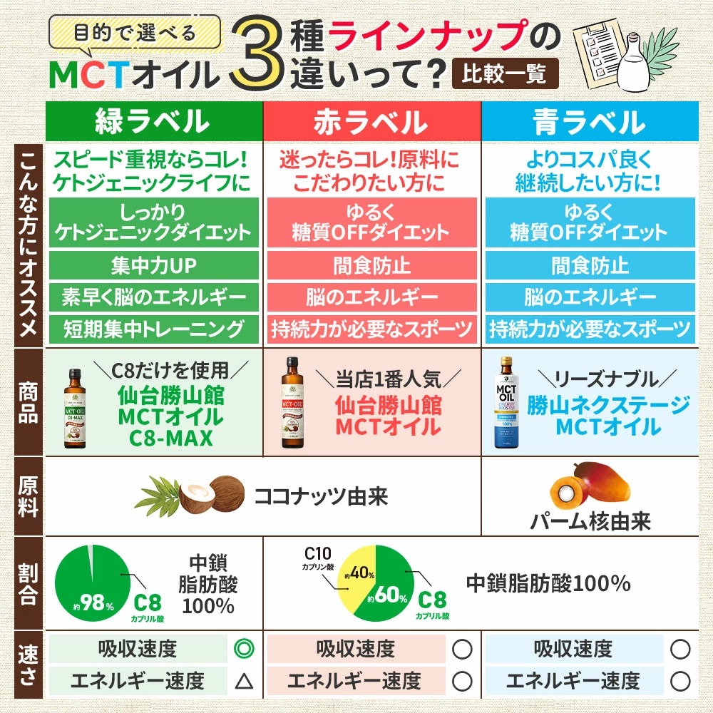 仙台勝山館では主に3種類のMCTオイルを取り扱っていて