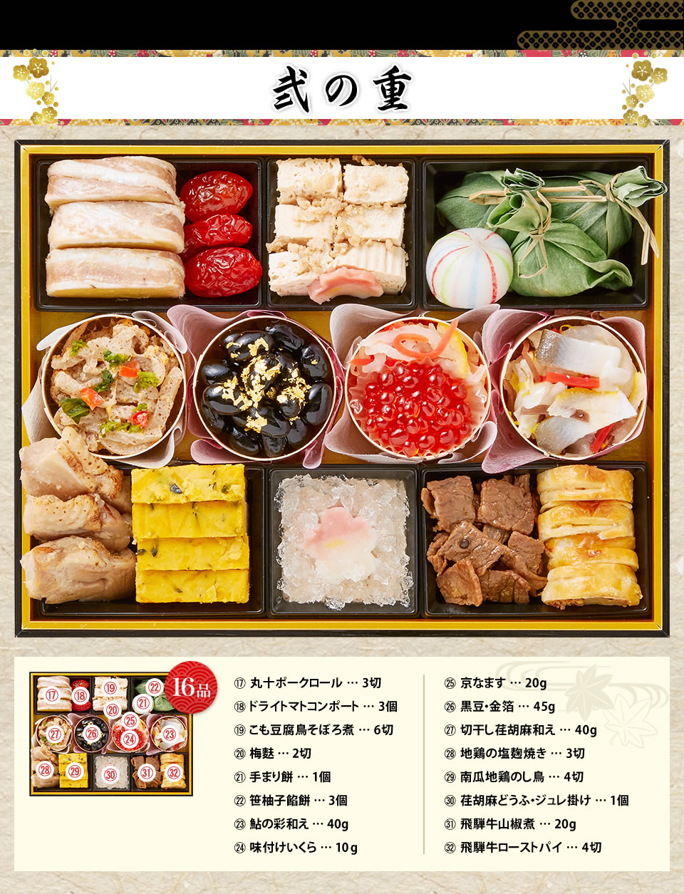 このおせちの顔「飛騨牛ローストパイ」や郷土料理「こも豆腐鳥そぼろ煮」に加え、