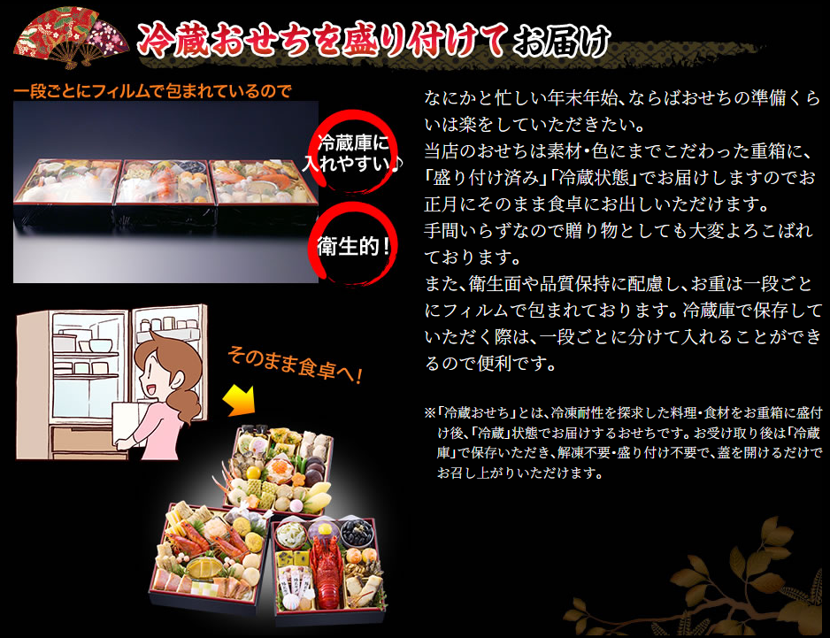 (盛付済の冷蔵おせちなので、準備の手間なく本格的な味が楽しめます) - 本物の味を求める、美食家の方