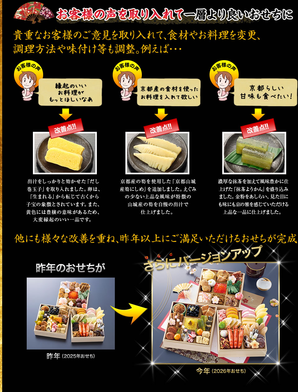 2026年のおせちは、昨年お客様から寄せられた貴重なご意見を元に、さらに満足度の高いお重へとパワーアップしました!