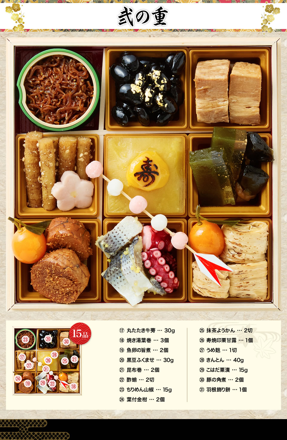 壱の重には、新年の始まりにふさわしい、縁起の良い品々が美しく詰められています。注目は、お客様の声で進化した【工場長おすすめ】の新作「だし巻玉子」。京料理の基本である出汁の風味を存分に味わえる、ふっくらとジューシーな逸品です。