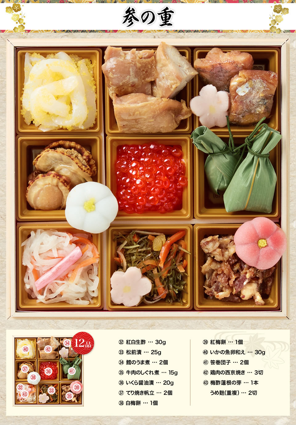 参の重(12品目):海の幸を中心とした、彩り豊かなご馳走