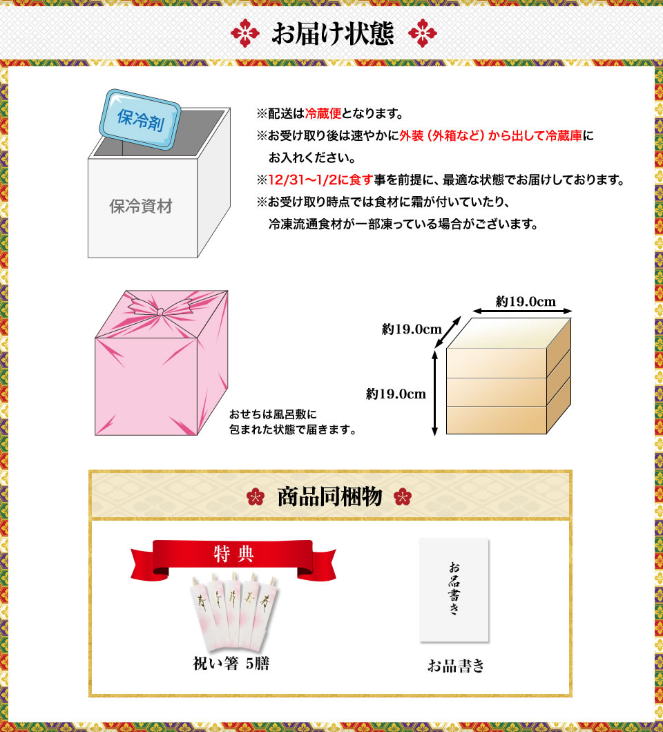 届いたら箱から出して、お重のまま冷蔵庫で保存してください。 - 【お正月】すぐに食卓へ