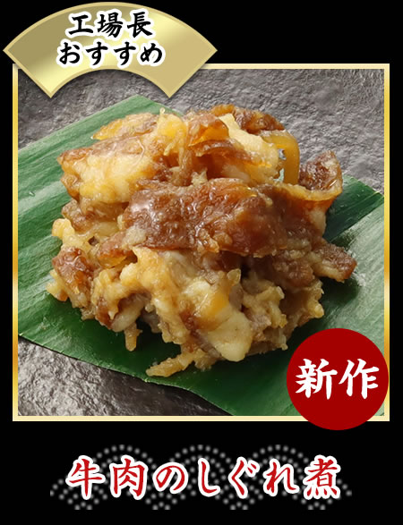 参の重は、海の幸を中心とした、彩り豊かなご馳走が満載です。こちらも【工場長おすすめ】の新作「牛肉のしぐれ煮」。甘辛い味付けが食欲をそそり、ご飯のお供にも、お酒の肴にもぴったりな逸品です。
