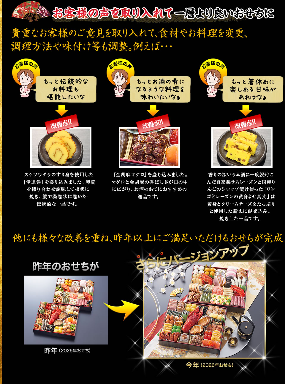 匠本舗のおせちは、お客様からいただいた貴重なご意見を元に、毎年改良を重ねています。2026年のおせち「輝希」は、昨年いただいたお声を元に、さらにご満足いただける内容へと進化しました。