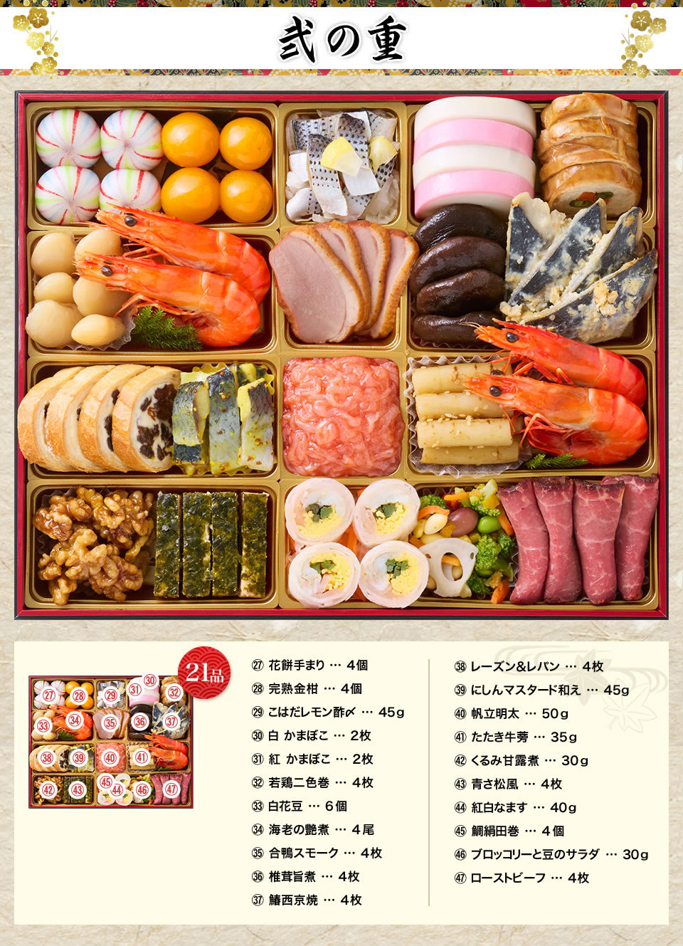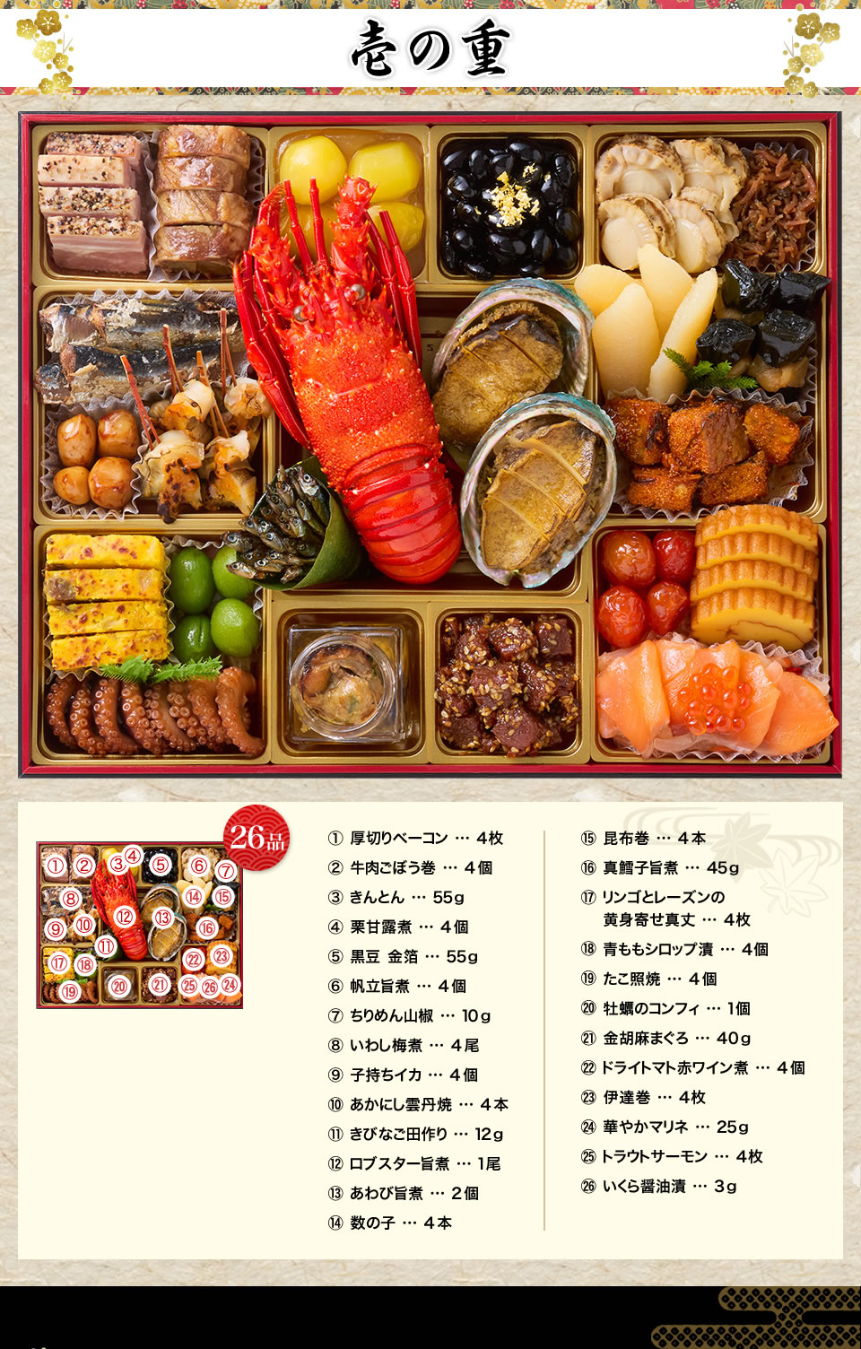 全種類4人前が良くて注文しました。冷蔵品でしたが、軽く冷凍された状態で届いたのは残念でした。中の黒豆が散らばってたのにもがっかり。でも味はなかなか美味しかった。魚系や酢物が多くて、肉類はもっと種類が欲しかったです。あわびは柔らかくて美味でしたが、伊勢海老?は見た目だけで、味はイマイチ、いらなかった。