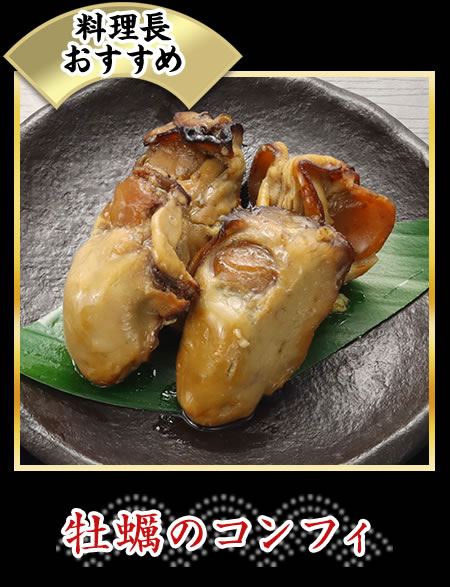 【料理長おすすめ】牡蠣のコンフィ 広島県産の新鮮な牡蠣を、特製醤油ダレでじっくり炊き上げ、オイルに漬け込みました。牡蠣の濃厚な旨味が口いっぱいに広がる、クリーミーで贅沢な逸品です。 |