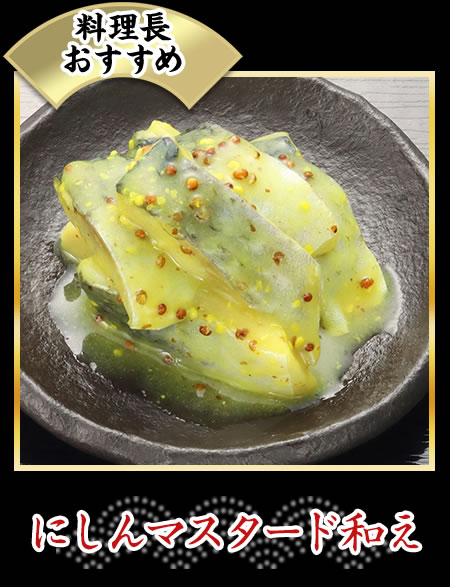 【料理長おすすめ】にしんマスタード和え 脂ののったにしんを、プチプチとした食感が楽しい粒マスタードで和えた創作料理。爽やかな酸味と上品な辛味が、濃厚な料理の合間の箸休めに最適です。 |