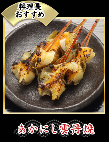 【料理長おすすめ】あかにし雲丹焼 こりこりとした食感が楽しいあかにし貝を、風味豊かな雲丹だれで香ばしく焼き上げました。磯の香りと雲丹の濃厚な味わいが、お酒のお供にもぴったりです。 |