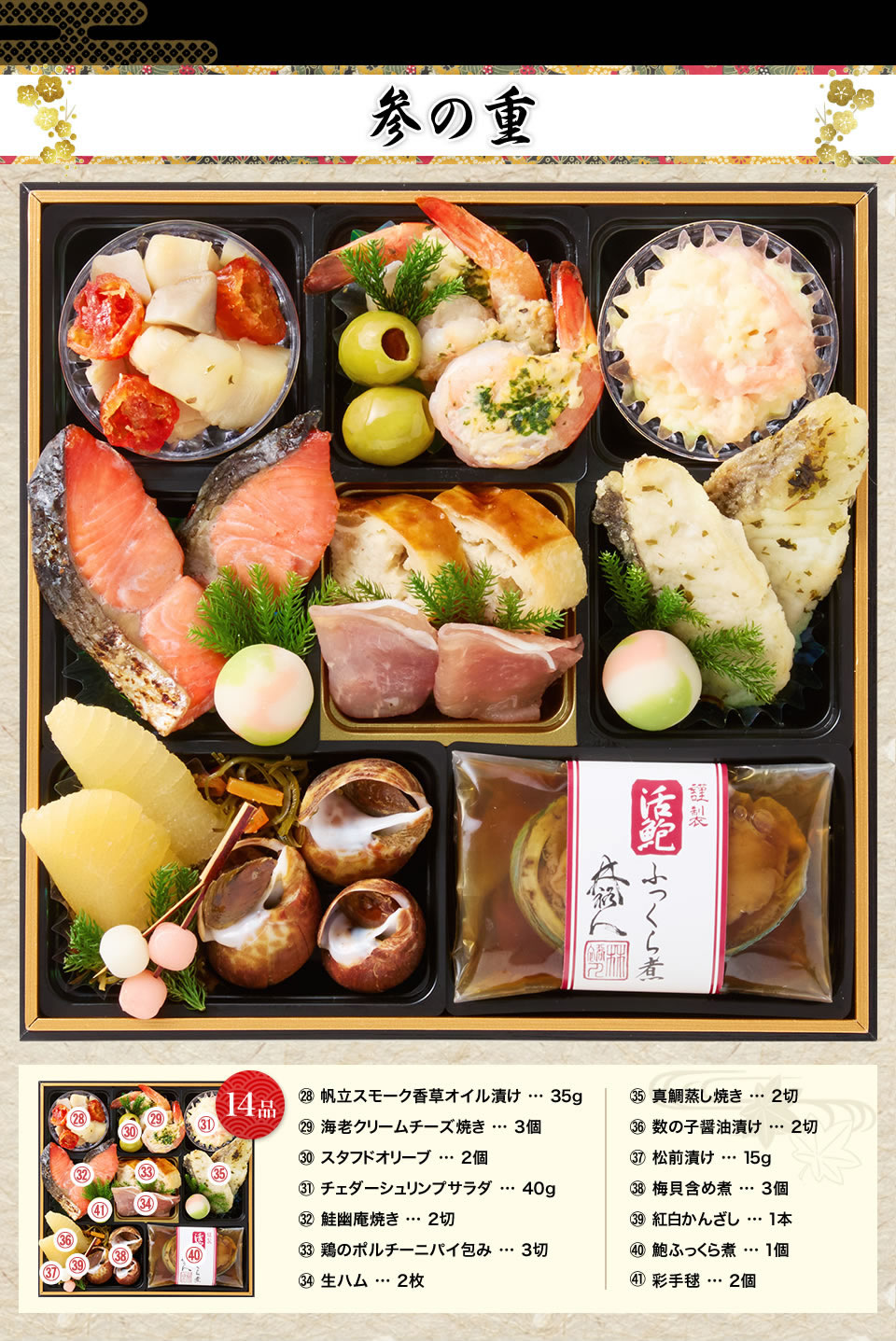 こだわり②:全41品目が主役級!豪華食材をふんだんに使用した三段重