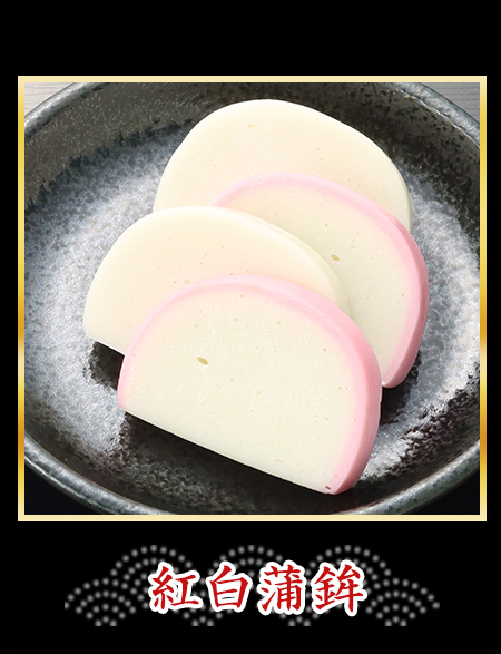 紅白かまぼこ:赤は魔除け、白は神聖さ。おめでたい!(祝い・日の出)