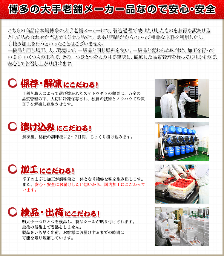 • 安心の品質:「訳あり」でも中身は本物!博多の大手老舗メーカーが、一般品と全く同じ原料・工程で、徹底した品質管理のもと国内加工しています。