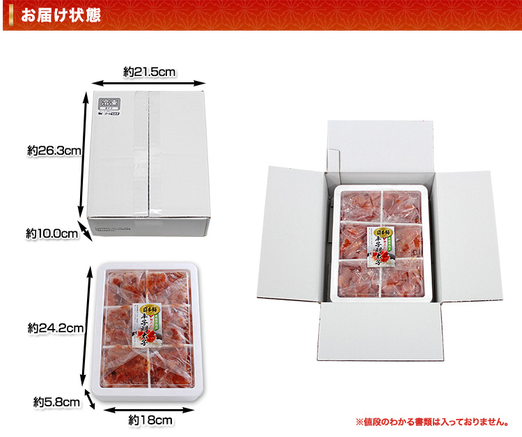 訳あり明太子を購入しましたが、全く問題ありませんでした。味もよく小分けしていただいていたので、食べる分だけ解凍していただきました。味はバッチリでした。同じ企画があれば、購入させていただきます。