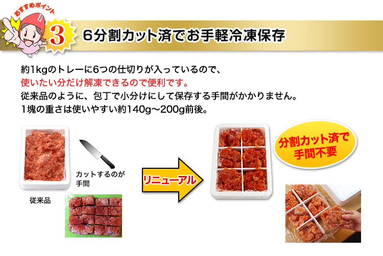 • 神仕様!6分割:約1kgのトレーが6つのブロック(1塊約140g~200g)に分かれているので、包丁いらずで解凍・保存が超カンタン!