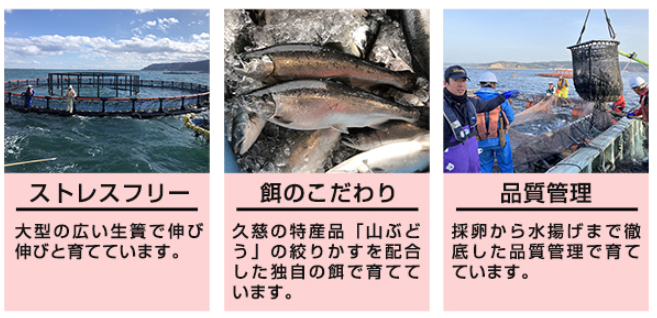 どちらも、北三陸の冷たくてキレイな海で、漁協の方々が大事に大事に育てた信頼の国産サーモンです。