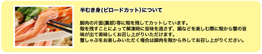 でも、この商品は「半むき身(ハーフポーション)」といって、カニの美味しい脚の部分の殻が、半分だけカットされているんです!