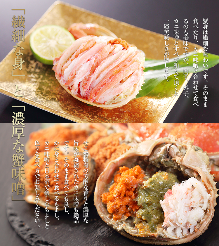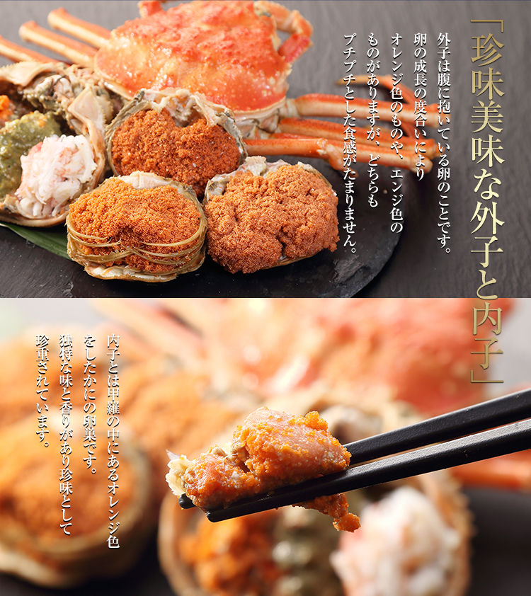 - セコガニ(メス): 体は小さいけど、濃厚な卵が美味しい!