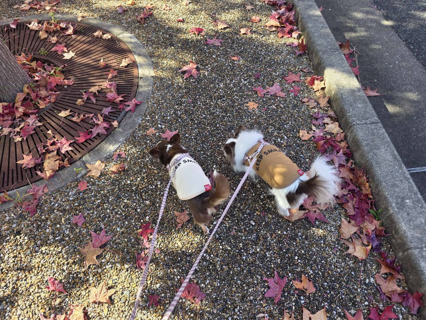 秋になると、落ち葉が地面に積もって散歩道が黄色や茶色の絨毯に。