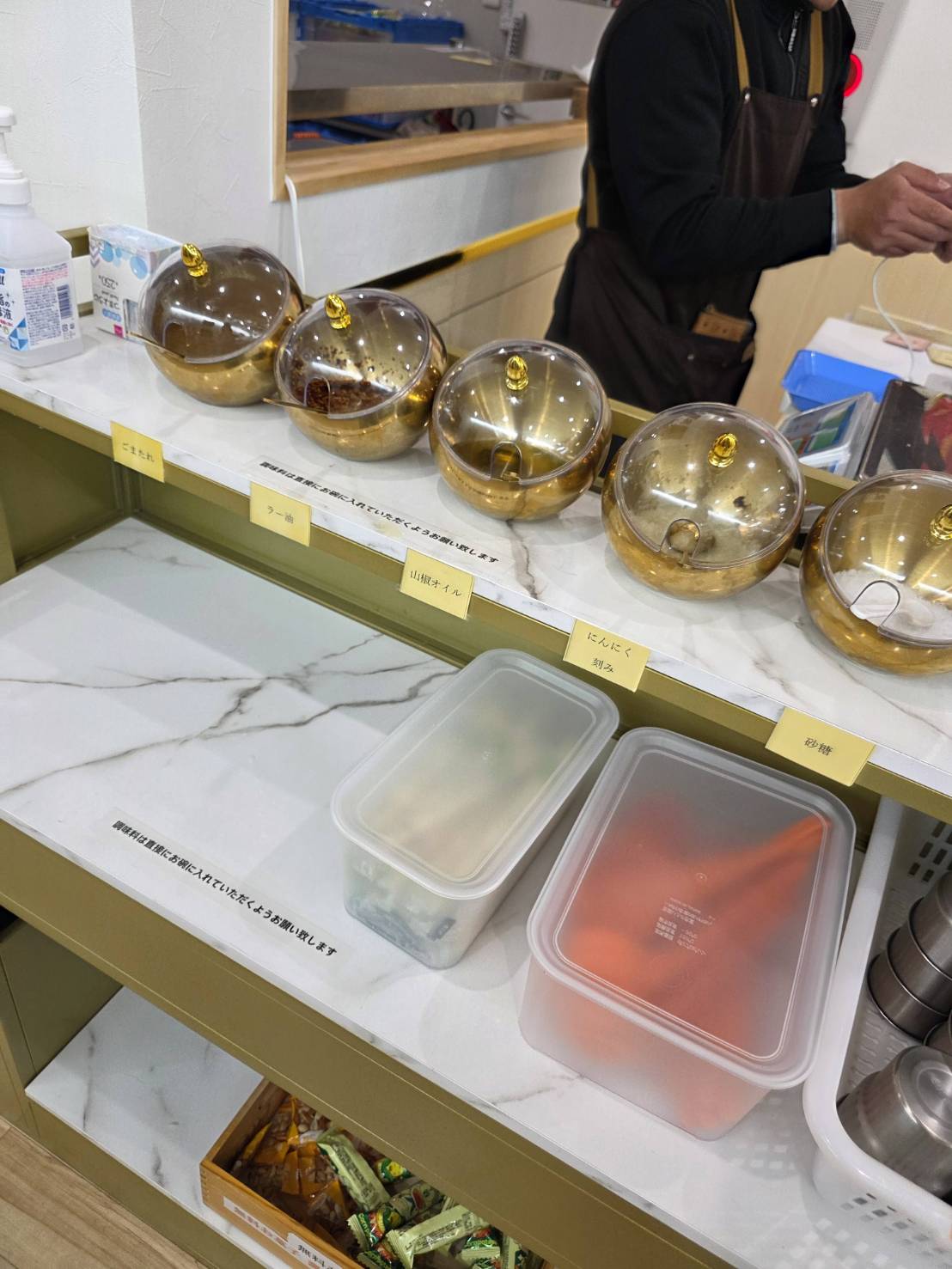 左から、ごまたれ・ラー油・山椒オイル・ニンニク刻み・砂糖