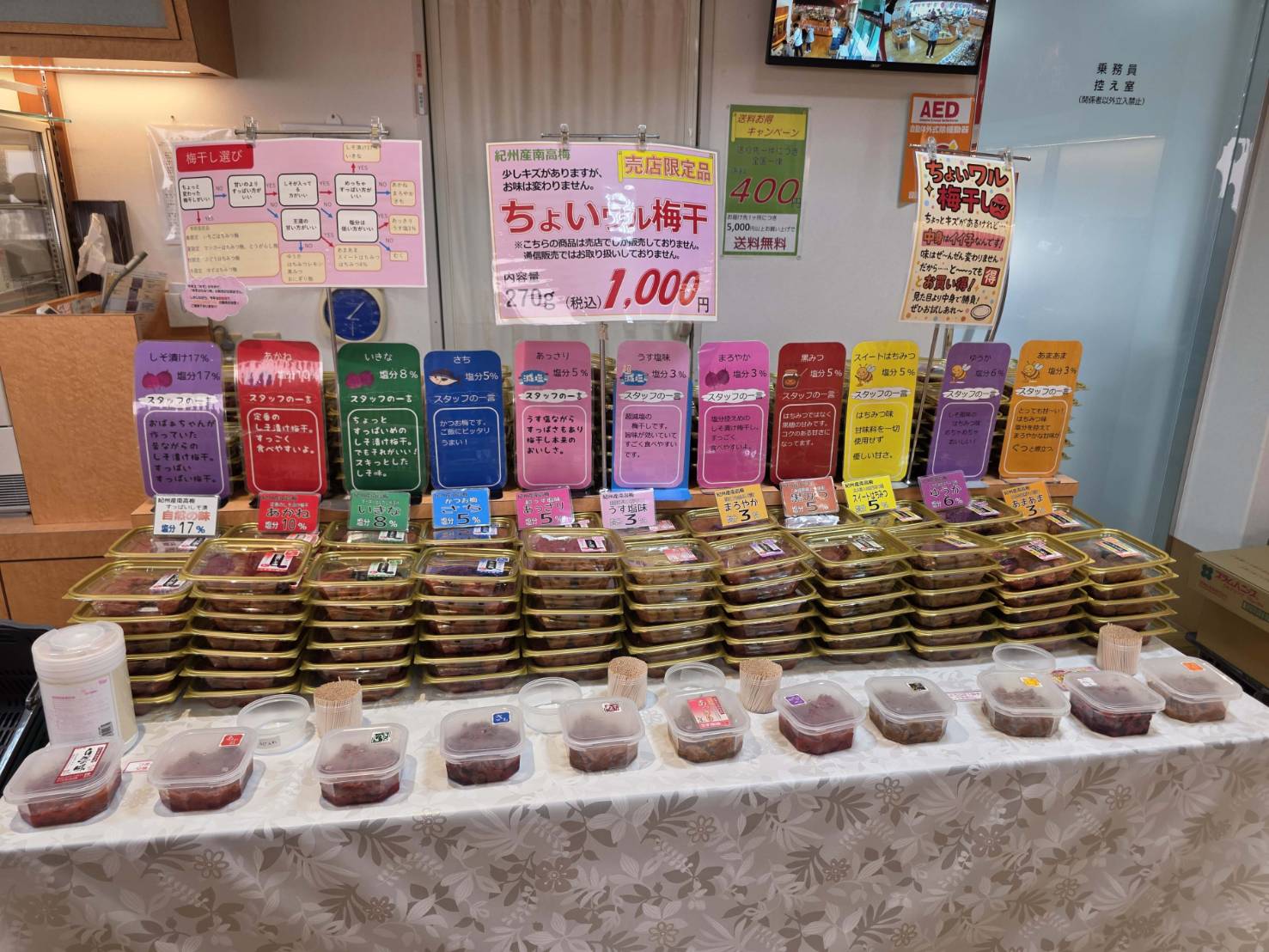 梅干しはところどころに試食用の梅が出されていて