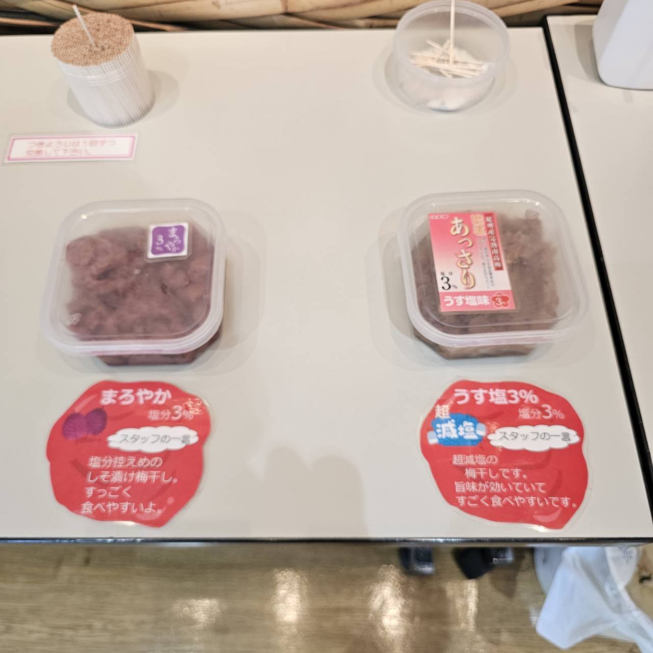 試食用の梅の側には爪楊枝が置かれていて、1回1回爪楊枝を変えて試食ができます。