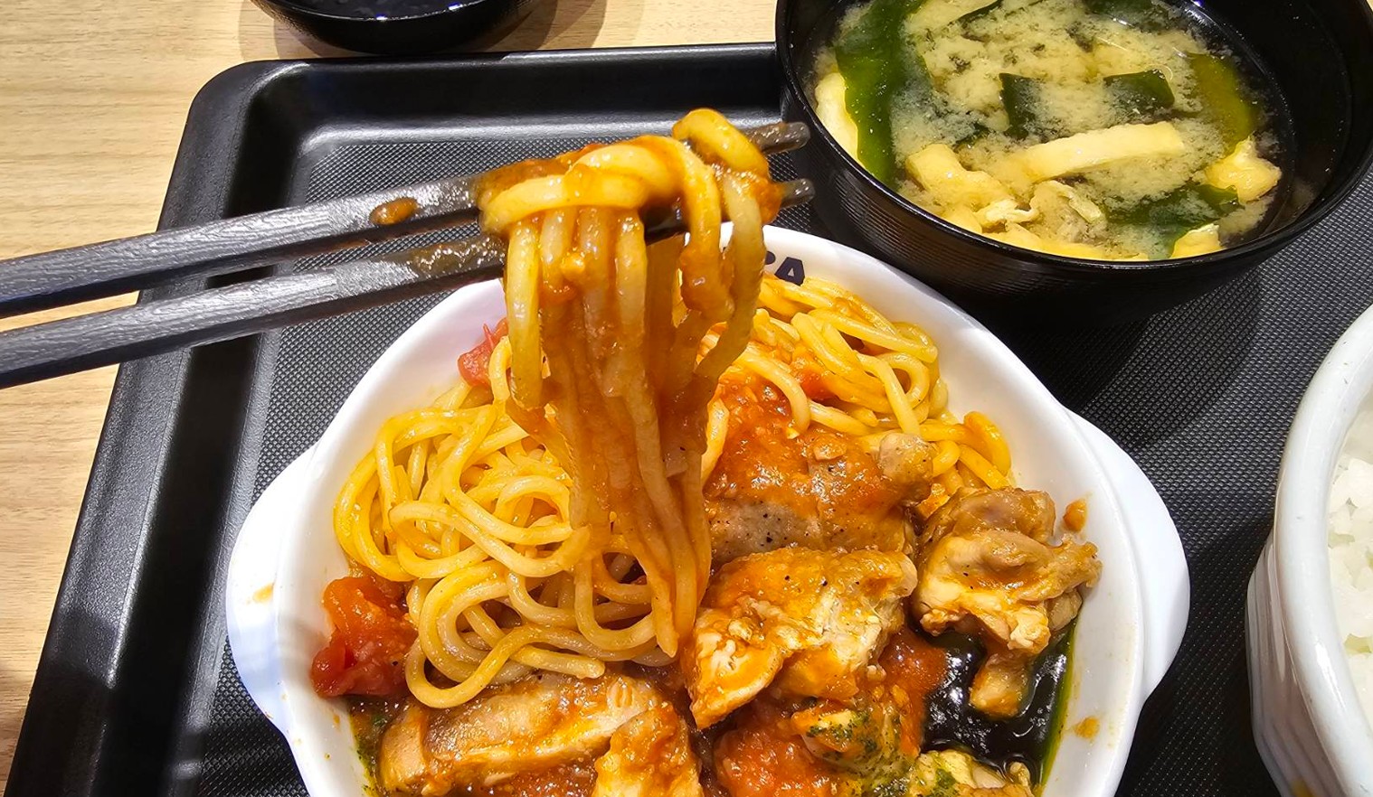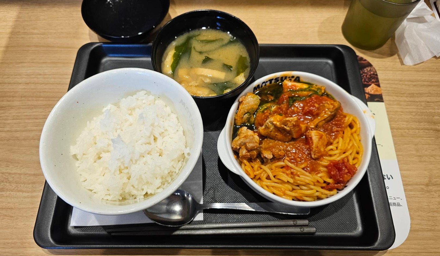 パスタだけど味噌汁が付いてきてフォークはありません。