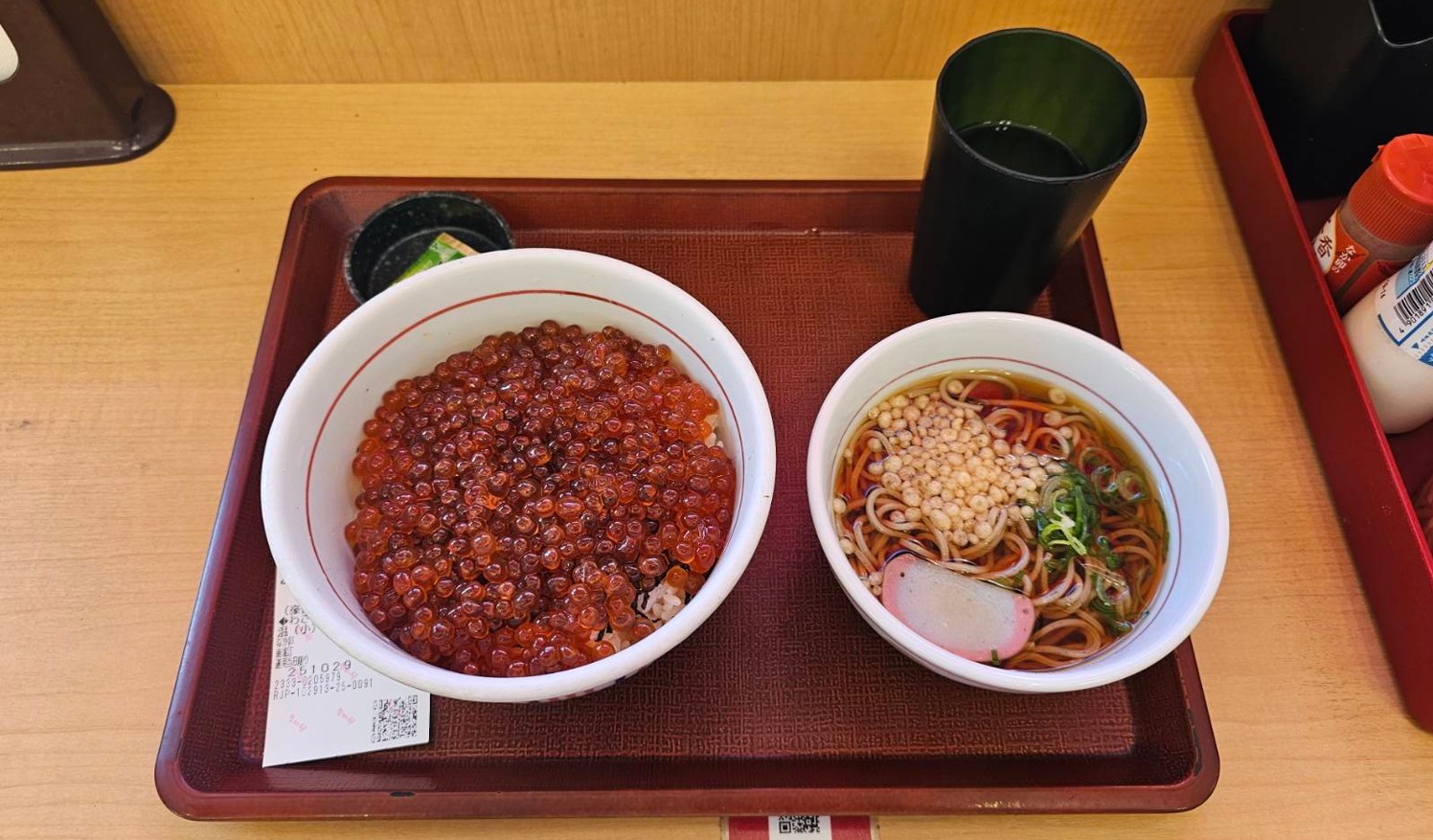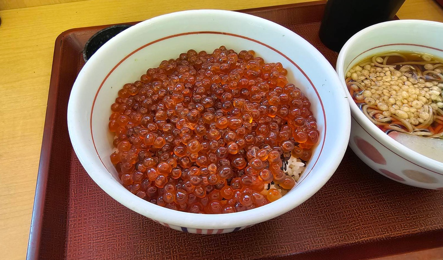眼前に顕現したいくら丼豪快盛りお値段2980円、調子に乗ってそばもつけたのでしめて3330円