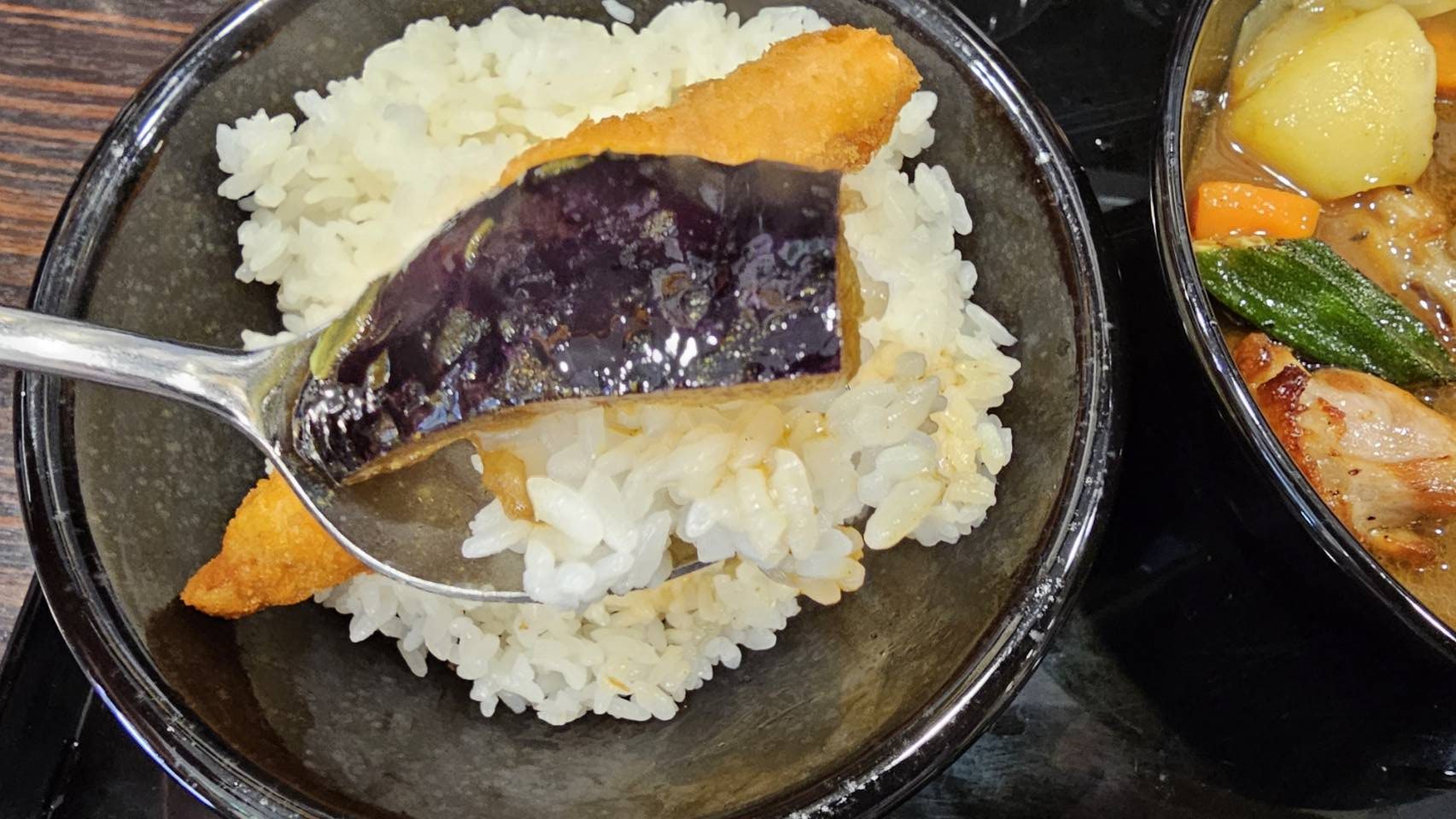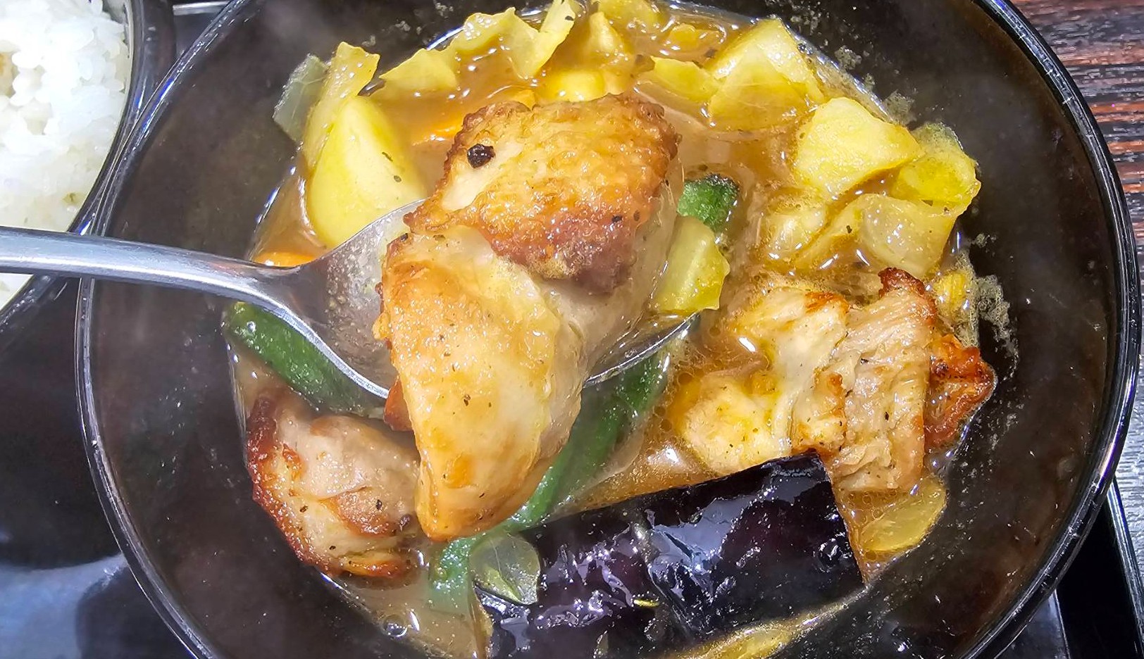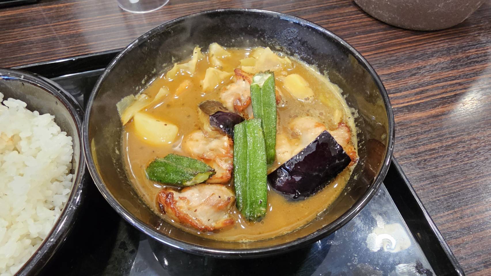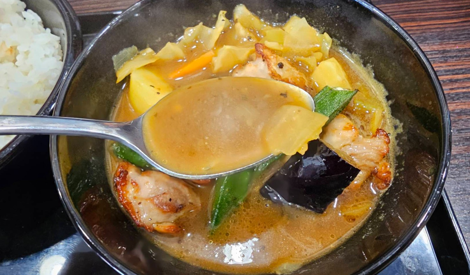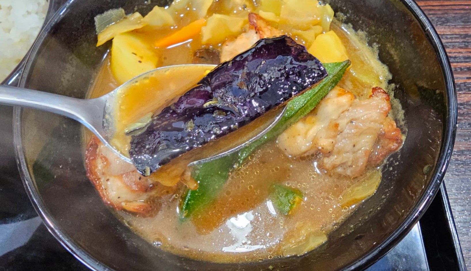 ジャガイモ、ニンジン、ナス、オクラの野菜が持つ自然な甘みと食感がスープカレーの味わいを一層引き立ててる!